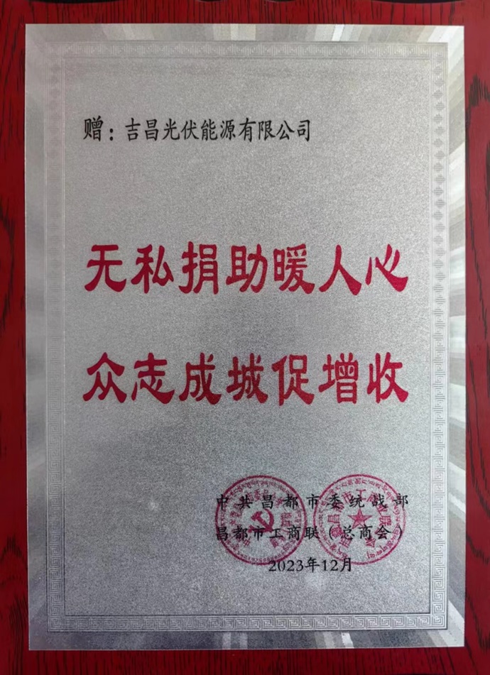 4月26日,中共昌都市委統(tǒng)戰(zhàn)部、昌都市工商聯(lián)(總商會(huì))聯(lián)合授予西藏開投吉昌光伏能源有限公司“無(wú)私捐助暖人心 眾志成城促增收”榮譽(yù)獎(jiǎng)牌,對(duì)公司充分發(fā)揮典型示范帶動(dòng)效應(yīng),有效增強(qiáng)“萬(wàn)企興萬(wàn)村”促增收、“百企幫百戶”等活動(dòng)影響力和凝聚力,為昌都市鄉(xiāng)村振興貢獻(xiàn)企業(yè)力量予以肯定和鼓勵(lì)?!?/div>